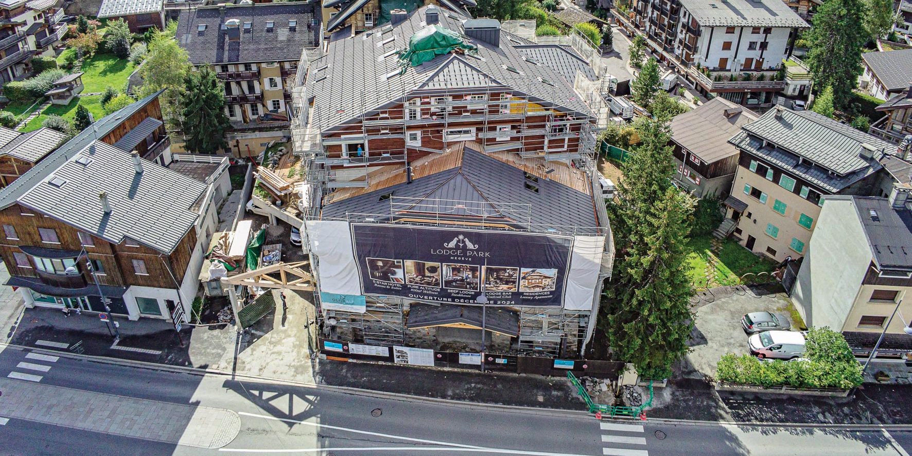 Avec un parement en pierres à sa base et des façades en bardage bois, le futur hôtel-restaurant-spa 5* se revêt des codes architecturaux traditionnels de l’habitat montagnard local pour un rendu des plus authentiques. Derrière ces murs, les aménagements vont bon train et, les cloisons étant désormais toutes posées, l’habillage intérieur des nombreuses pièces peut désormais commencer.
