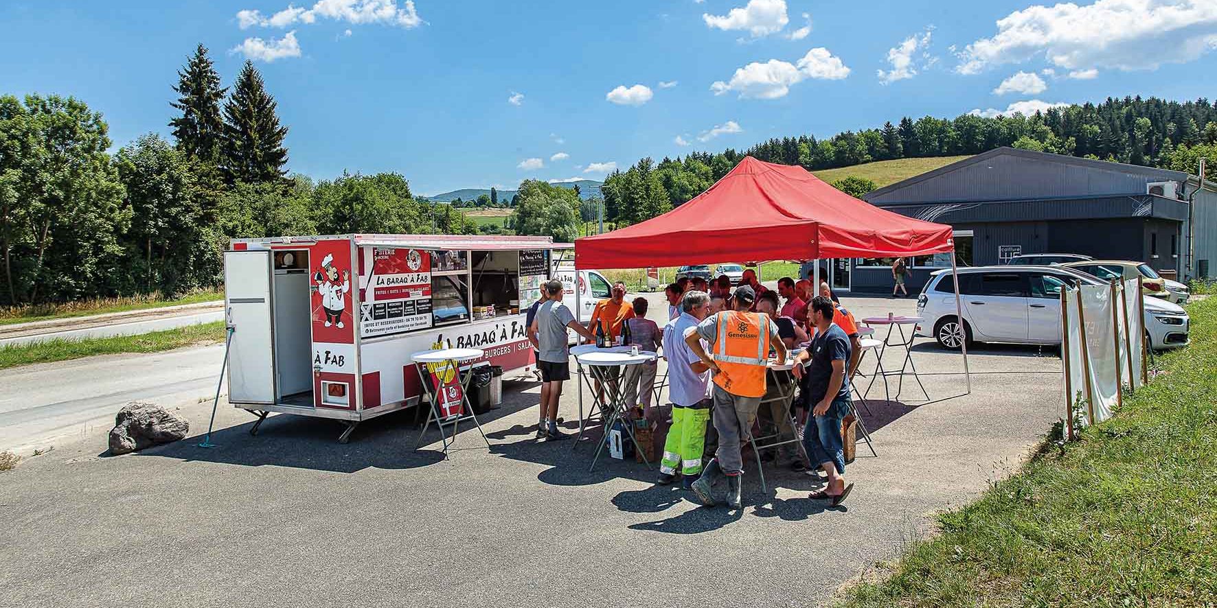 Aussi, avons-nous fait appel au food-truck local de La baraq’à Fab qui est venu s’installer sur le parking juste face au chantier ! Frites maison, burger au diot-vin blanc et boissons rafraichissantes, les terrassiers et maçons ont plus qu’apprécier ce moment de détente sous la tonnelle, sympathique et convivial, avant de reprendre courageusement leur activité sous un soleil de plomb et une chaleur écrasante.