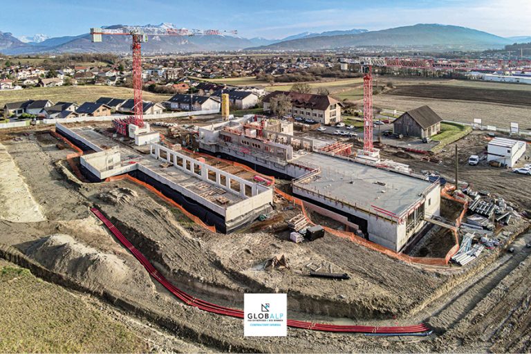 De la rue principale du village, en dehors de la présence d’une grue, l’on pourrait penser qu’il n’y a aucune activité sur le chantier de la future auberge communale multi-services de Vovray-En-Bornes, Rhone-Alpes, France Pourtant, en y regardant de plus près, en contrebas, c’est une vraie fourmilière et les équipes Globalp Contractant Général composées de…